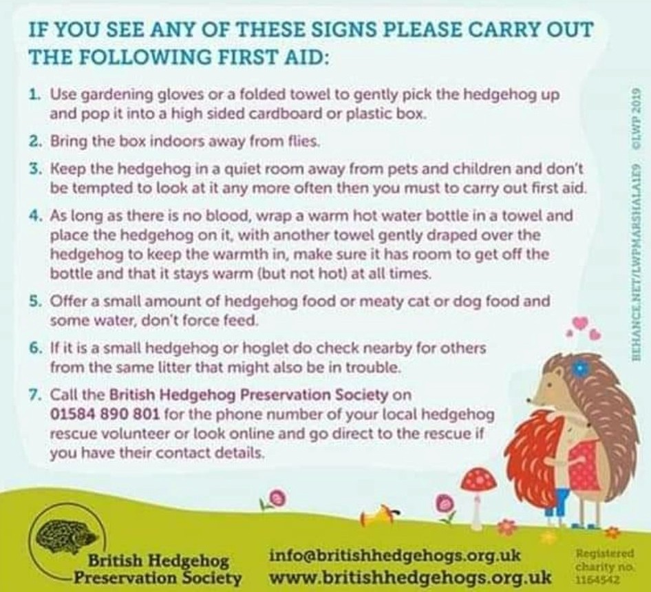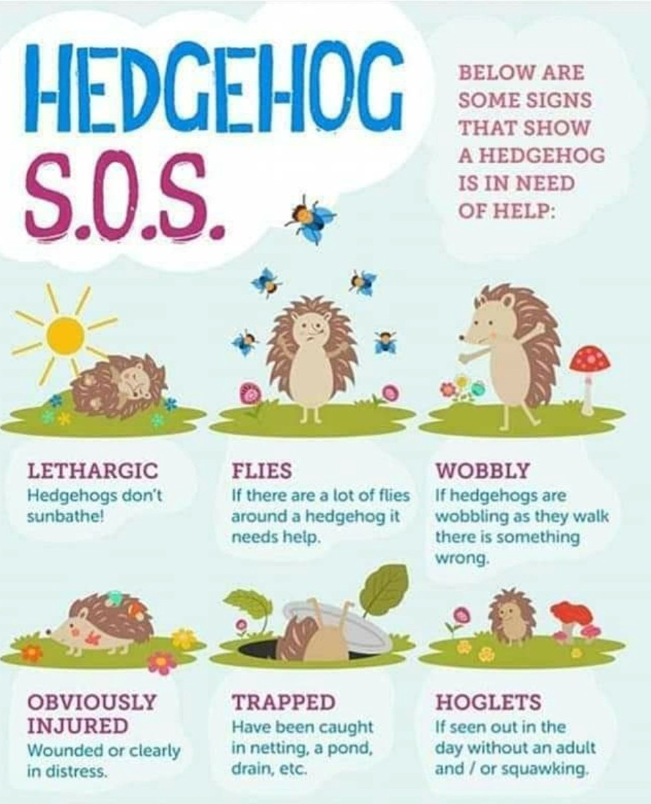 If you do see a hedgehog out during the day or you have concerns, remember hedgehogs do not sunbathe and they shouldn't wobble when walking. If it's trapped, a baby or it has an injury it will need help. Not all hedgehog issues are visible, they can have an overburden of internal parasites and have a cough or what seems like cold. If a hedgehog does need rescuing you will need a high sided box as they are very good at climbing and escaping. Something to cover it such as a towel or fleece and somewhere it can go away from sunlight and flies. There are diseases that can pass from hedghogs to us and precautions must be taken so gloves, towel or similar should be used to pick the hedgehog up. Please do not wait to make the call or try to look after them yourself.
