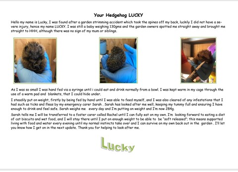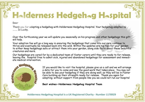By adopting a hedgehog as a gift or for yourself you will be helping us rescue even more hedgehogs. Your adoption will last 12 months and for a one off payment of £25 you will receive your adoption card telling you all about your hedgehog's story. You will also be sent via e-mail, quarterly news letters with updates on their story and helpful tips, advice and other hedgehog stories. If you would like to adopt a hedgehog please contact us via our e-mail: holdernesshedgehogadoption@gmail.com